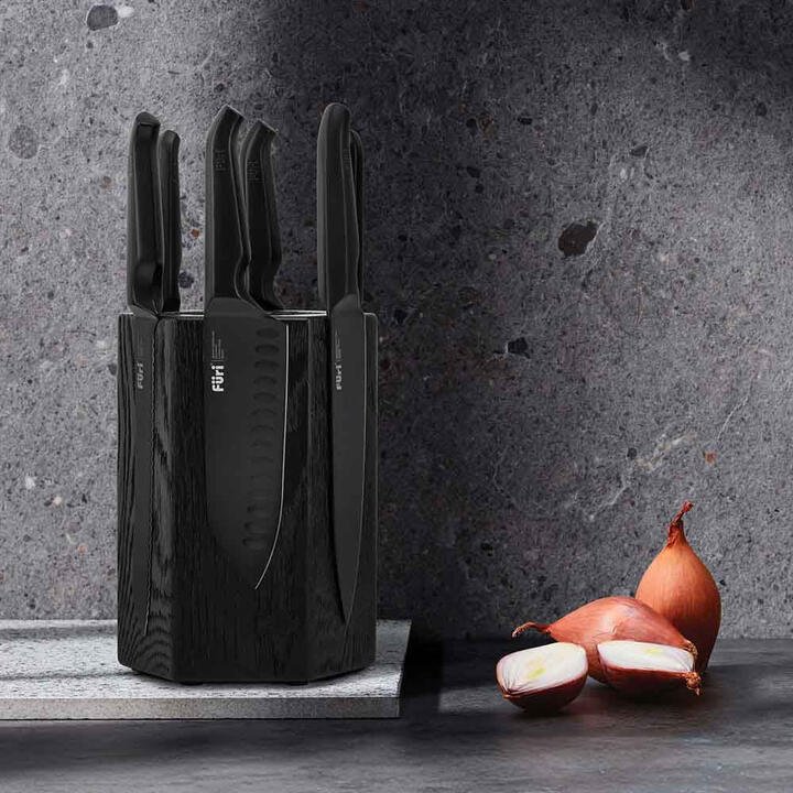 The versatile Furi Jet Black Magnetic Hexagonal knife block holds knives on the outside, for easy identification, or more discreetly inside; or in a combination of both. The block comes with six Furi knives constructed from X50CrMoV15 Japanese stainless steel. Features • Jet Black Magnetic Hexagonal Block stores up to 12 knives, 6 knives on the outside and 6 knives inside • Unrelenting sharpness Tech edge blades, hand-sharpened to 26° cutting angle and hardened to 55-57 HRC • Precision crafted X50CrMoV15 Japanese stainless steel blade for edge retention and rust resistance • Reverse-wedge, anti-fatigue handle designed to lock into the hand and reduce slip towards the blade • Optimised bolster fully protects fingers while allowing full use of the blade all the way to the heel • 25 Year Warranty What Am I Buying• East/West™ Santoku Knife 17cm • Cook’s Knife 20cm • Carving Knife 20cm • Bread Knife 20cm • Utility Knife 15cm • Asian Utility Knife 12cm • Magnetic Hexagonal knife block Materials Japanese stainless steel