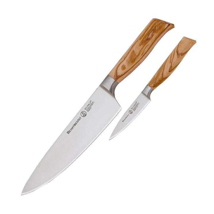 Upgrade your knife collection with the stunning craftsmanship of Messermeister and the Oliva Elite Chef & Paring Knife Set. Fully forged from the finest quality German steel with a complete tang and a stunning Mediterranean olive wood handle, the Messermeister Oliva Elite Chef & Paring Knives are as attractive as they are useful. Featuring an ingenious bolster-less design, the Messermeister Oliva Elite Chef & Paring Knives provides a simplified yet superior approach to cutting, sharpening, and honing tasks that makes use of the entire blade from heel to tip. Slice through meats, vegetables, roasts, and more with pure ease and in complete comfort. Features• Hand crafted German steel blade set includes 2 of the most used kitchen knives ideal for preparing a variety of meat, fruit, vegetables, poultry, and produce• Part of the exquisite Oliva Elite collection• Full tang blade with chic Mediterranean olive wood handle• Bolster-less heel simplifies all cutting, sharpening, and honing tasks and makes use of the entire blade• Hand stropped on a cloth wheel to create the sharpest possible cutting edge• Provides superior balance and control for all cutting tasks• Hand wash onlyDimensions• Paring Knife: 9cm• Chef’s Knife: 20cmCare InstructionsHand wash onlyMaterialsStainless Steel, Forged Wood