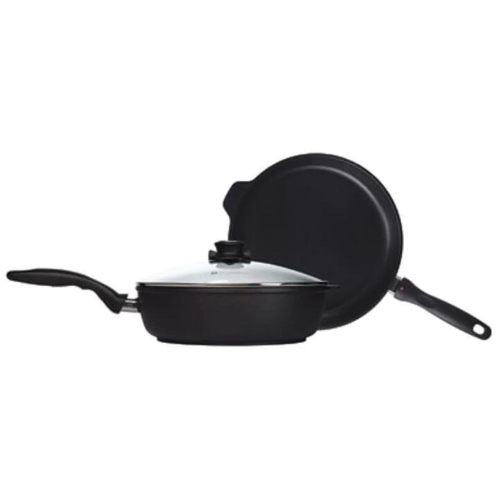 Upgrade your kitchen with the Swiss Diamond 3 Piece Combo Set, featuring a 28cm Fry Pan, 28cm saute Pan, and a universal 28cm glass lid that fits both pans securely. Crafted with Swiss Diamonds latest XD nonstick coating, this set contains 20% more real diamonds than the previous generation, delivering unmatched durability and effortless food release. Say goodbye to scrubbing—food residue simply slides off, making cleanup easier than ever. Each pan is constructed from cast aluminium, ensuring it will never warp or bend and provides even heat distribution for precise cooking results. The oven-safe design up to 260°C, allows for seamless transitions from stovetop to oven, giving you ultimate flexibility. The included glass lid features an adjustable steam vent for moisture control, allowing you to monitor your cooking without lifting the lid. The easy-to-grasp knob ensures effortless handling. This set is not induction compatible. Features• Versatile 3-Piece Set – perfect for frying, sauteing, and one-pan meals• XD coating with 20% more real diamonds ensures superior durability, effortless food release, and healthier oil-free cooking• The PFOA-free, rivet-free surface prevents bacteria buildup and allows for quick and easy cleaning—just a rinse with warm, soapy water• The extra-thick cast aluminium body provides consistent heating, eliminating hot spots for perfect results every time• Oven-safe up to 260°C (500°F), allowing for effortless transitions from stovetop to oven for added versatilityWhat Am I Buying• 1 x 28cm Frypan• 1 x 28cm Saute Pan• 1 x 28cm Glass LidMaterialsAluminiumDimensions49.6cm x 29.9cm x 11.3cm