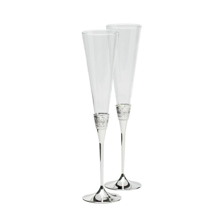Raise a toast with these elegant With Love Silver Toasting Flutes; delicately accented by silver bands. Inspired by Vera Wang’s iconic jewellery collection, the With Love Collection features drinkware, dinnerware and flatware characterised by a pattern of interlocking rings; symbolising the eternity of love. Features• Raise a toast with these elegant With Love Toasting Flutes; delicately accented by silver bands• Designed by Vera Wang exclusively for Wedgwood• Perfect gift for newlyweds• Crystal that looks fantastic and provides superior strength• Featuring a beautiful Bridal pattern• Packaged in Vera Wang giftboxMaterialsCrystal Dimensions19.8cm x 31.8cm x 7.7cm