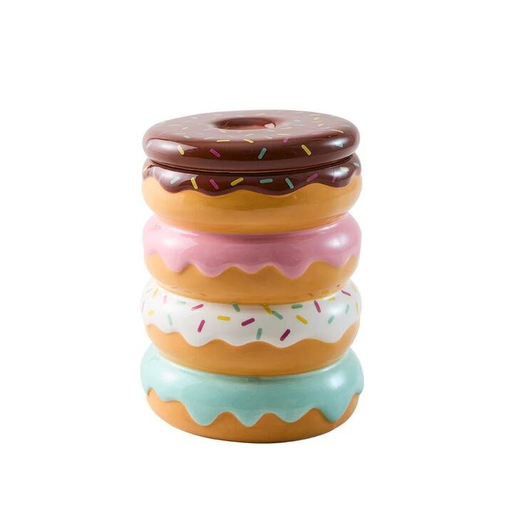 Store your treats in style with the Daily Dose by Ambrosia Cookie Jar. This novelty biscuit jar features a unique stacked donut design with vibrant glazed icing and colourful sprinkle detailing. Crafted from quality ceramic with a chocolate donut lid, this kitchen storage jar holds biscuits, cookies, and sweet treats whilst adding delightful charm to your worktop. Perfect as a fun gift for sweet lovers or a playful addition to your kitchen accessories collection. Shop Daily Dose by Ambrosia for more fun and quirky kitchenware that’s perfect for gifting, or to bring a daily dose of whimsy to your kitchen!Features Stacked donut shape with classic chocolate, pink, glazed, and mint icing effects plus colourful sprinkles Spacious design provides ample room for biscuits, cookies, sweets, and treats to keep your favourites fresh and accessible Removable chocolate-glazed donut lid with vibrant sprinkle decoration provides easy access whilst keeping contents fresh and protected Durable, food-safe ceramic with smooth glazed finish ensures long-lasting use and makes a delightful gift for bakers Shop Daily Dose by Ambrosia for more fun and quirky kitchenware thats perfect for gifting, or to bring a daily dose of whimsy to your kitchen!MaterialsStonewareDimensions12cm x 12cm x 16cmManufacturedMade in China