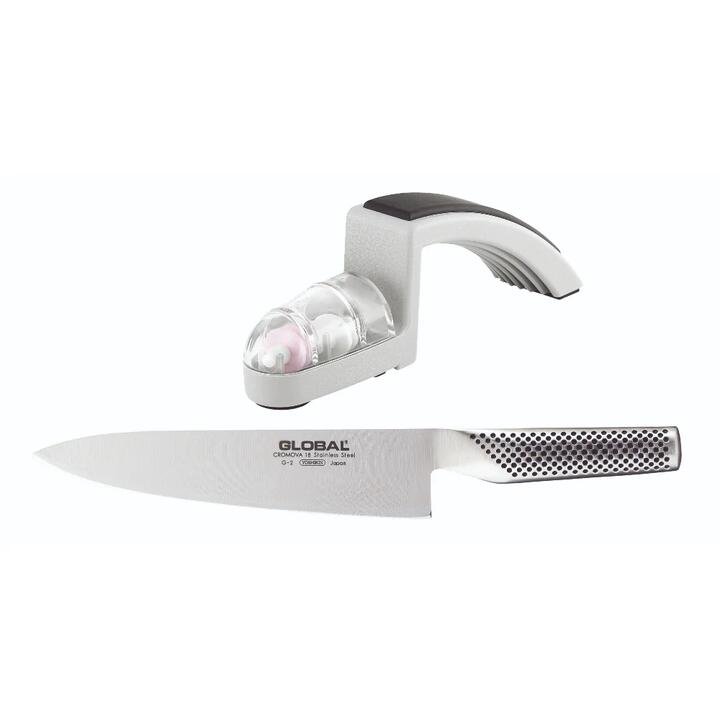 This set combines our best-selling GGlobal Classic 20cm Cooks Knife and two stage MinoSharp sharpener, ensuring your knife always remains razor sharp. Global knives are made from CROMOVA 18 stainless steel, specially developed by Global as it holds a razor-sharp edge and resists rust, stains and corrosion. Ice tempered and hardened to Rockwell C56-58, each knife is carefully weighted for optimum performance and balance. Other unique features include its smooth contours and seamless construction which eliminates food and dirt traps offering the ultimate in safety and hygiene. The acute 15-degree angle cutting edge provides unsurpassed performance and superior edge retention. Features CROMOVA 18 stainless steel blade, edge retains razor sharpness and resists rust, stains and corrosion Acute 15 Degree Cutting Edge, provides unsurpassed performance and superior edge retention Ice tempered and hardened to Rockwell C56-C58 Smooth contours and seamless construction eliminate food and dirt traps, offering the ultimate in safety and hygiene Perfectly balanced handles precisely calibrated to offset the weight of the blade Made in JapanWhat Am I Buying 1 x 20cm Cooks Knife 1 x Knife SharpenerMaterialsStainless SteelDimensions25cm x 15cm x 10cm