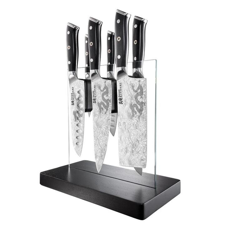 Upgrade your kitchen with the Baccarat® KIYOSHI® Kiyo Japanese Knife Block. KIYOSHI® introduces blade-smith perfection & precision with stunning trademark Dragon Insignia across each of the 6 knives in this block. Housed in a sleek magnetic knife block, the Kiyo will be a feature piece in any kitchen.BRAND CREDENTIALSBaccarat® KIYOSHI® range features distinctive Damascus inspired blades inspired by traditional Japanese craftsman and Samurai sword makers, being characteristic of banding and mottling reminiscent of flowing water. Each blade also has a distinctive trademark Dragon insignia.Baccarat® KIYOSHI® knives have been crafted from the finest Japanese Steel 420J2 and ice-hardened ensuring superior blade strength and durability. The Japanese steel blade construction has been inspired by century old manufacturing techniques to create a super sharp cutting edge which holds a greater edge retention. This technique is favored by traditional Japanese craftsman.The KIYOSHI® Japanese Steel has been mined in the same Japanese region of Chuo-Ku Chiba since the middle of the last century. Each knife in the KIYOSHI® range has been engineered and tested to meet Rockwell 53 specification guaranteeing the blades hardness, and optimum Performance.Backed by the Baccarat® LIFETIME GUARANTEE.
