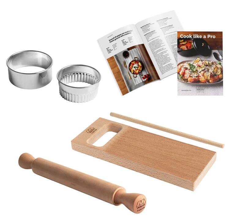 The Marcato brand name is synonymous for quality. They are famous worldwide for their “Made in Italy” pasta machines and related accessories. This quality 7pc set will make creating gnocchi a fun and easy activity for all. Features Made in Italy Gnocchi board & rolling pin is made from pear wood which is hard & durable Includes a gnocchi board with a garganelli accessory, rolling with made from pear wood, 1 x smooth ring, 1 x fluted ring, apron and recipe bookDimensionsPackaging Dimensions: 30cm x 18cm x 9.5cm