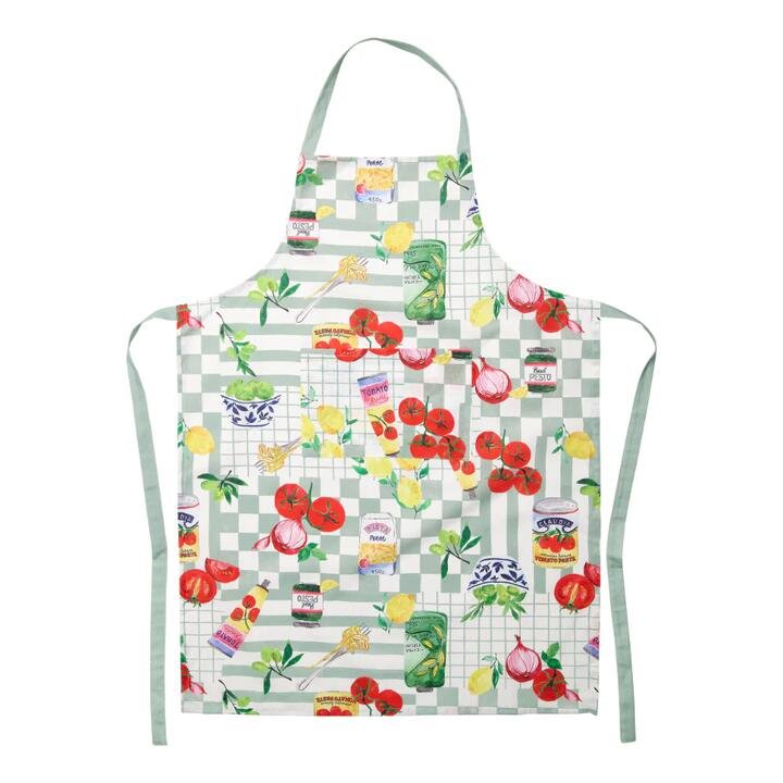 The Porto Valentina Apron Sage features glorious and vivid illustrations celebrating classic Italian ingredients inspire your cooking and welcome everyone to the table with the Valentina napery collection. Features The hand-painted artwork in striking reds, lush greens and vibrant yellows are displayed atop tiled and striped backgrounds in a welcoming palette of sage green and earthy saffron The Valentina napery collection features apron and oven gloves, as well as table cloth, napkins and tea towelsMaterialsCottonDimensions35cm x 18cm x 1cmManufacturedMade in India