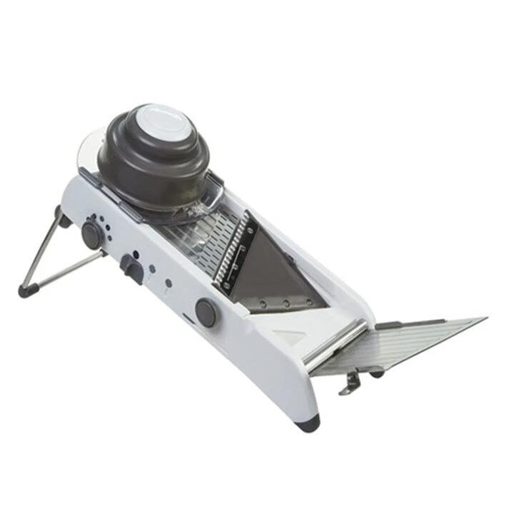 Features Designed to save you time in the kitchen, this slicer cuts through ingredients in no time! Wide stainless steel slicing deck is designed to allow food to glide easily Features non-slip feet for safety and stability while slicing Thicknesses vary from 1mm, 3.5mm, 5.5mm and 7.5mm Versatile kitchen essential allows you to julienne, waffle cut and slice your favourite vegetables for fuss-free food preparation Razor sharp stainless steel blades slice with ease and precision Ultra-durable and easy to clean, this mandoline slicer is dishwasher safe for your convenienceDimensionsL35cm x W14cm x H16cm (unfolded)