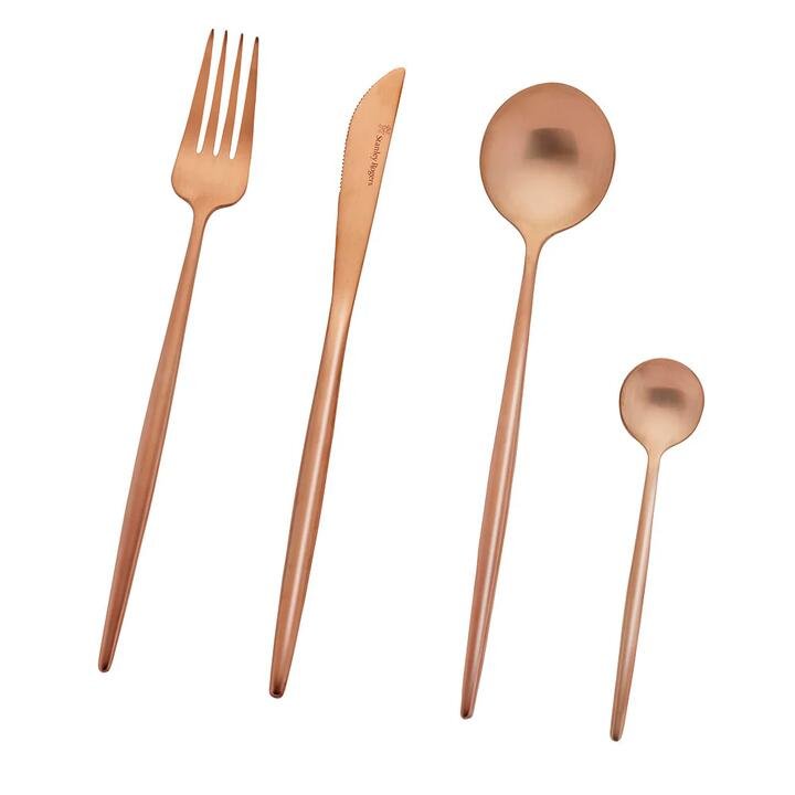 Introducing the Stanley Rogers Piper 16 Piece Cutlery Set. Add more designer style to your table with Piper. The elegant slim bronze titanium coated handles in satin-brushed finish are sure to impress. Forged from premium 18/10 stainless steel to last a lifetime. Available in 3 on-trend colours, Bronze, Satin, and Black to suit any style or casual table setting. Set includes 4 x Forks, 4 x Knives, 4 x Dinner Spoons, and 4 x Teaspoons. Features Slim, elegant bronze titanium coated handles Elegantly gift boxed for easy gifting for housewarmings, engagements, or weddings Dishwasher Safe Designed in Australia by Stanley Rogers Crafted with premium forged 18/10 cutlery for exceptional entertaining What Am I Buying 4 x Forks 4 x Knives 4 x Dinner Spoons 4 x Teaspoons Materials Stainless Steel Dimensions 30cm x 20cm x 8cm