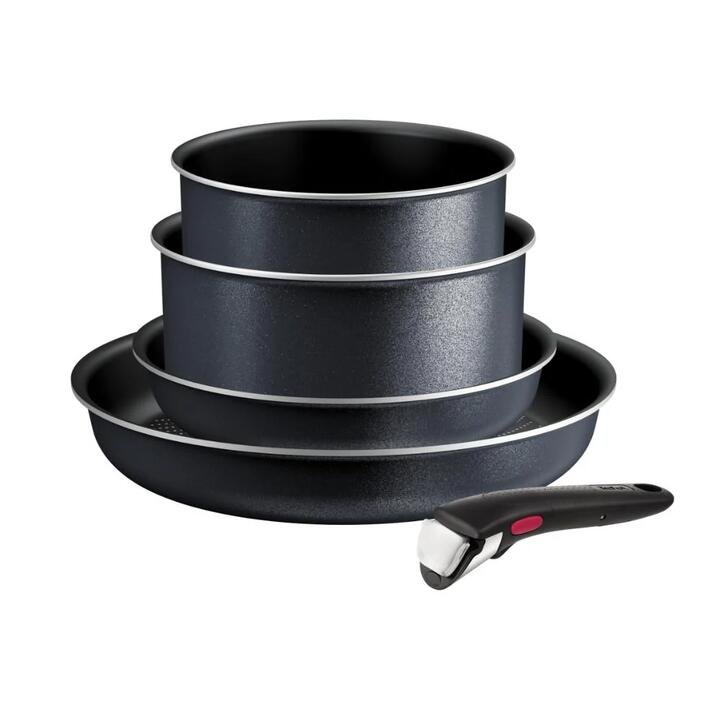 Much More than a Pan! Our ultra-convenient removable handle pans offer smarter home cooking: grill, stew, roast and bake with ultra-stackable, easy-to-clean cookware. This perfect starter set 2 frypans (22cm & 28cm), 2 Saucepans (18cm & 20cm), and 1 sturdy removable handle. Features Essential cookware set: A versatile 5-piece cookware set: 24cm & 28cm frypans, 18cm & 20cm saucepans, and 1 removable handle Sturdy long-lasting removable handle: A removable handle for heavy-duty use with total peace of mind: 3-point safety system, supporting to 10 kg (according to internal tests) and protected by our 10-year guarantee (this Tefal guarantee does not affect the statutory rights a consumer may have or those rights that cannot be excluded or limited, nor rights against the retailer from which the consumer purchased the product). The lightest* Ingenio induction pan: Thanks to our new Light Tech technology, Ingenio So’Light pans are up to 28% lighter (*compared to Ingenio Unlimited, Tefal’s classic induction range) Titanium non-stick: Titanium-infused coating for excellent non-stick performance—ensuring effortless clean-up and cooking that fully preserves nutrients and flavour. Rapid heating: Thanks to the Light Tech Technology, the pan heats up in a flash for fast cooking results. Compatible with all cooktops, including induction. Made in France: Our innovation-driven products are made from high-quality materials and with the utmost care, promoting the excellence of French expertise. Oven safe up to 250°C excluding handle What Am I Buying 22cm Frypan 28cm Frypan 18cm Saucepans 20cm Saucepans 1 x Removable Handle Materials Aluminium